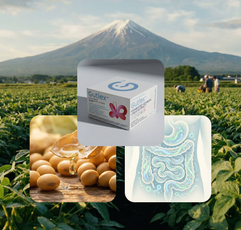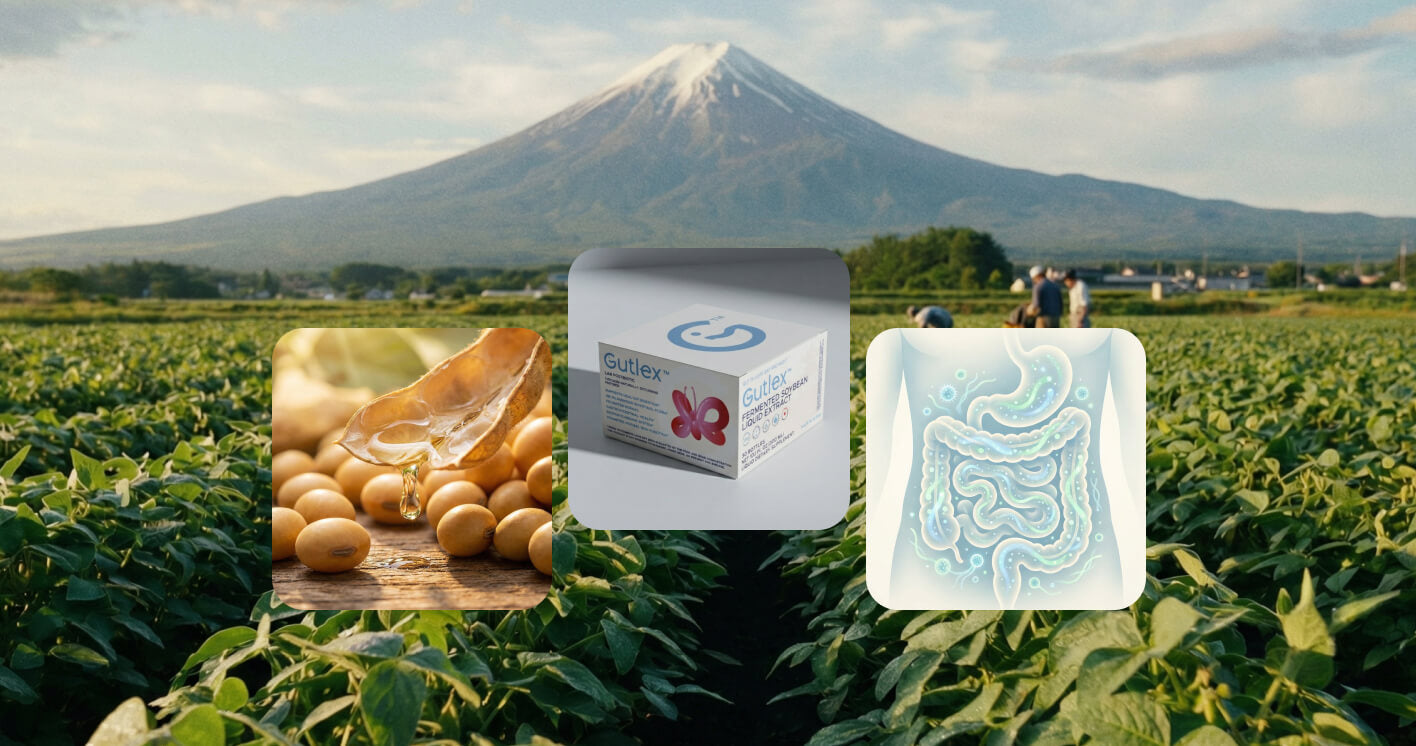 Gutlex begins with the highest-quality non-GMO soybeans, cultivated with meticulous care in the fertile soils at the foot of Mount Fuji. These soybeans undergo a proprietary fermentation process with 16 strains of Lactobacillus. Over a period of 12 months, the lactobacilli break down the soybeans, producing a rich combination of metabolites. These include short-chain fatty acids (SCFAs), peptides, amino acids, and other bioactive compounds. Unlike traditional probiotics, this fermentation process creates metabolites that are ready to work immediately, without the need for live organisms.